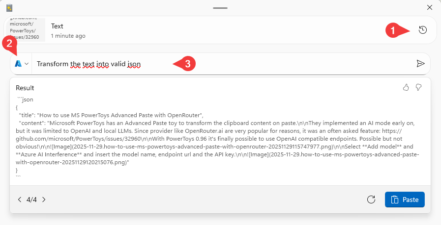 Then, when using Advanced Paste you have access to the clipboard history, select the model, write in the prompt and get a result.